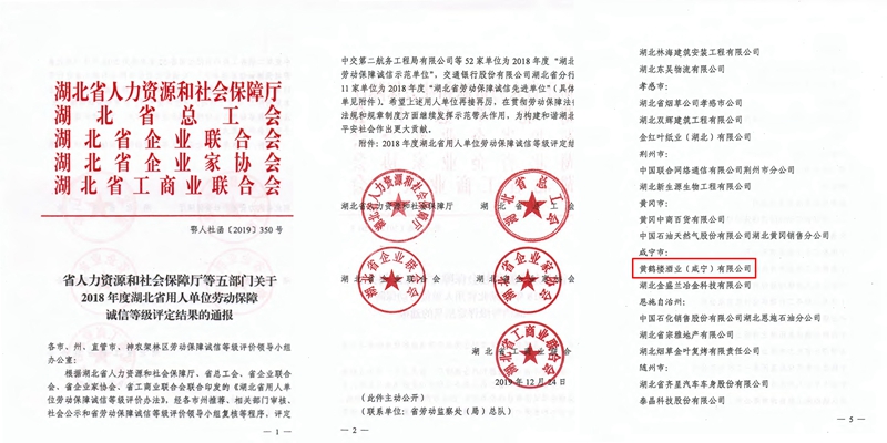 近日,经湖北省人力资源和社会保障厅等五部门评定,黄鹤楼酒业(咸宁)有限公司被授予“2018年度湖北省用人单位劳动保障诚信示范单位”称号。