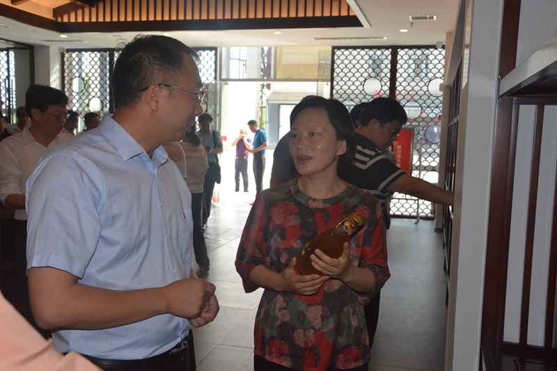 闫英姿一行参观了商贸中心、黄鹤楼酒文化馆、美酒银行,在商贸中心,闫英姿对景区独有的“香城壹号”桂花清酒展现出浓厚兴趣,李良分别从口感、酿造技艺、优质原材料等方面作出详细介绍。